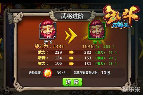 在《乱斗三国志》中,战力还可以通过武将进阶来提升!当武将所有装备进阶要求时(例如:装备等级达到10级、20级),主公们即可为武将进阶,进阶后武将颜色等级提升,同时各项属性也得到极大的提高。进阶需要进阶丹,可通过“三足鼎立”副本和黑市商人获取。