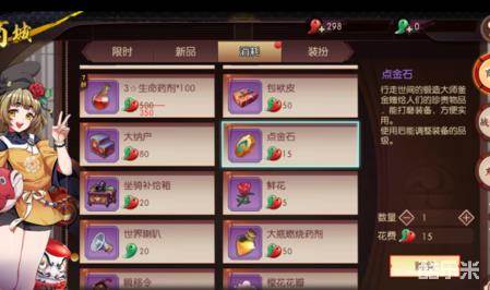 以上玩家通过【福利】获得点金石毕竟有限,如果玩家想要获得大量的点金石,通过【商城】→【消耗】页面花费勾玉购买是最直接的方式。