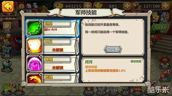 关于技能,一是军师技能,二是武将技能。随着主公等级的提升,通过技能碎片可逐步解锁更多军师技能。军师技能都是类似于提高生命值、减小所受伤害等而作用于所有上阵武将的被动技能。每个武将都有4个武将技能,初始带1个技能,其余3个随着武将品质的提升而激活,如绿色品质一阶激活第二个技能且为必杀技能。必杀技能需在战斗中积累满能量手动点按进行施放,威力巨大。武将技能升级消耗金钱,随便武将等级的提升,技能也能升级得越高。