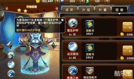 巫妖的第一个技能—霜冻护甲:为虚弱的二个英雄制造霜冻护甲,最少提示目标20%的护甲,并且额外增加护甲。(升级技能增加额外提示护甲值)