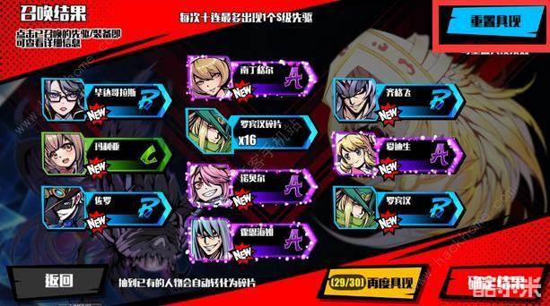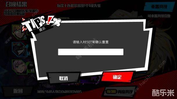 对10连抽结果不满意的童鞋们,可以在这个界面点击右上角的“重置具现”进行账号重置,重置后账号将被重置成刚刚通关主线1-5的状态