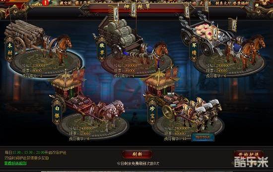 粮车分为五种,品质由低到高依次为木材、牧草、军绩、白银、珍宝。护送品质越高,奖励就越丰厚。玩家每天有两次免费刷新粮车的机会。使用道具“运粮车”可以刷新粮车改变其品质。