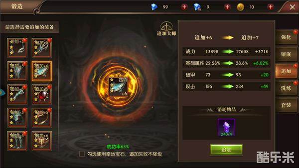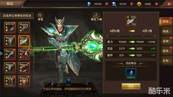 装备强化系统包括:强化,镶嵌,追加,洗炼,套装