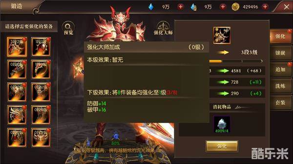 其中强化、追加、洗炼为初期能够直观提升战斗力的模式,而镶嵌和套装则需要较大的花销,在游戏初期不建议追求;