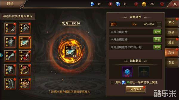 装备洗炼建议属性条格子全开,非常便宜,使用游戏币解锁,然后普通玩家使用钻石刷一次,必带紫色词条,有能力的玩家可以锁住紫色然后洗,普通玩家可以拿完这三条属性暂且搁置;