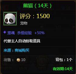 最后要介绍的这个家伙就是我们的国宝小熊猫,小熊猫可以说是前期必备的宠物,为什么说是前期必备呢?因为玩家在游戏前期的任务就是升级,而小熊猫的属性确正是经验+50%,小熊猫的出现可以大大增加玩家挂机打怪的经验,升级速度也能大幅度提升,由于网页游戏练级最快的速度就是挂机打怪,所以带着小熊猫的玩家在游戏中占有绝对的练级优势,而萌萌的小熊猫也是无数玩家的最爱,虽然在商城的价格高达五百八十八个钻石,但是二十天的使用时间足够玩家朋友打到一个很高的等级了,大家可以看到畅销商品当中小熊猫一度被玩家推崇到第二位。