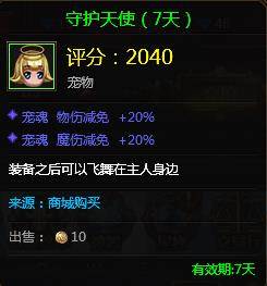 我们先来看一下可爱的守护天使吧,外观美丽的守护天使,只要天使飞临在身边,可以让玩家朋友受到的伤害大幅度下降,是玩家的好帮手,守护天使在商城中可以买的到,但却不是终身使用的,每次购买能够使用七天,但是这丝毫不影响,很多玩家朋友对宠物的购买。