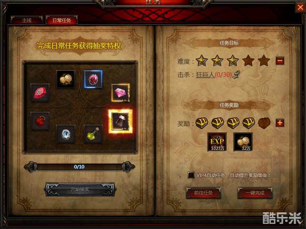 前面几个提到的都是副本,除了副本各位玩家朋友练级的时候千万不要忘记做日常任务。日常任务每天可以完成十次,十次任务基本全部都是让玩家去各个地图消灭于本身等级差不多的怪物,杀怪结束后可在日常任务界面直接交任务,每日任务获得的奖励非常高,足够升三级以上的经验了,所以大家千万不要错过,全部完成十环任务,玩家可以额外获得高额的经验奖励,建议玩家朋友在做日常任务打怪的过程当中,开启多倍经验。