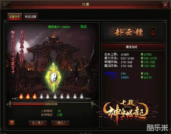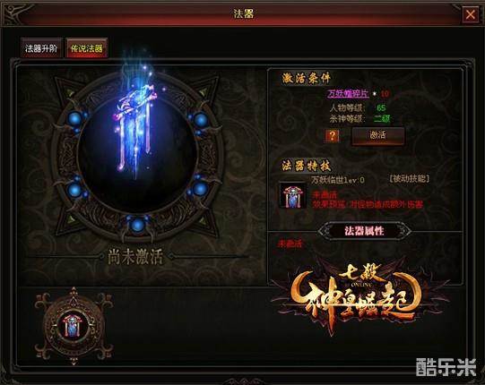 传说法器需要使用万妖幡碎片来激活,而且需要杀神等级。每一等级的法器都有不同的强大技能。万妖幡碎片可通过击杀深渊迷宫的BOSS获得!强大的属性加成,让你欲罢不能!(传说法器与法器属性叠加)