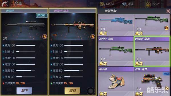 如图,巴雷特和紫色品质的AWM-翡翠相比,前者威力、穿透强于后者,便携和主弹夹数低于后者,其他数据保持一致,即:论输出和穿透效果,前者占优;论续航和手持移速,后者占优。