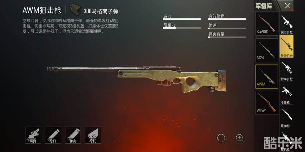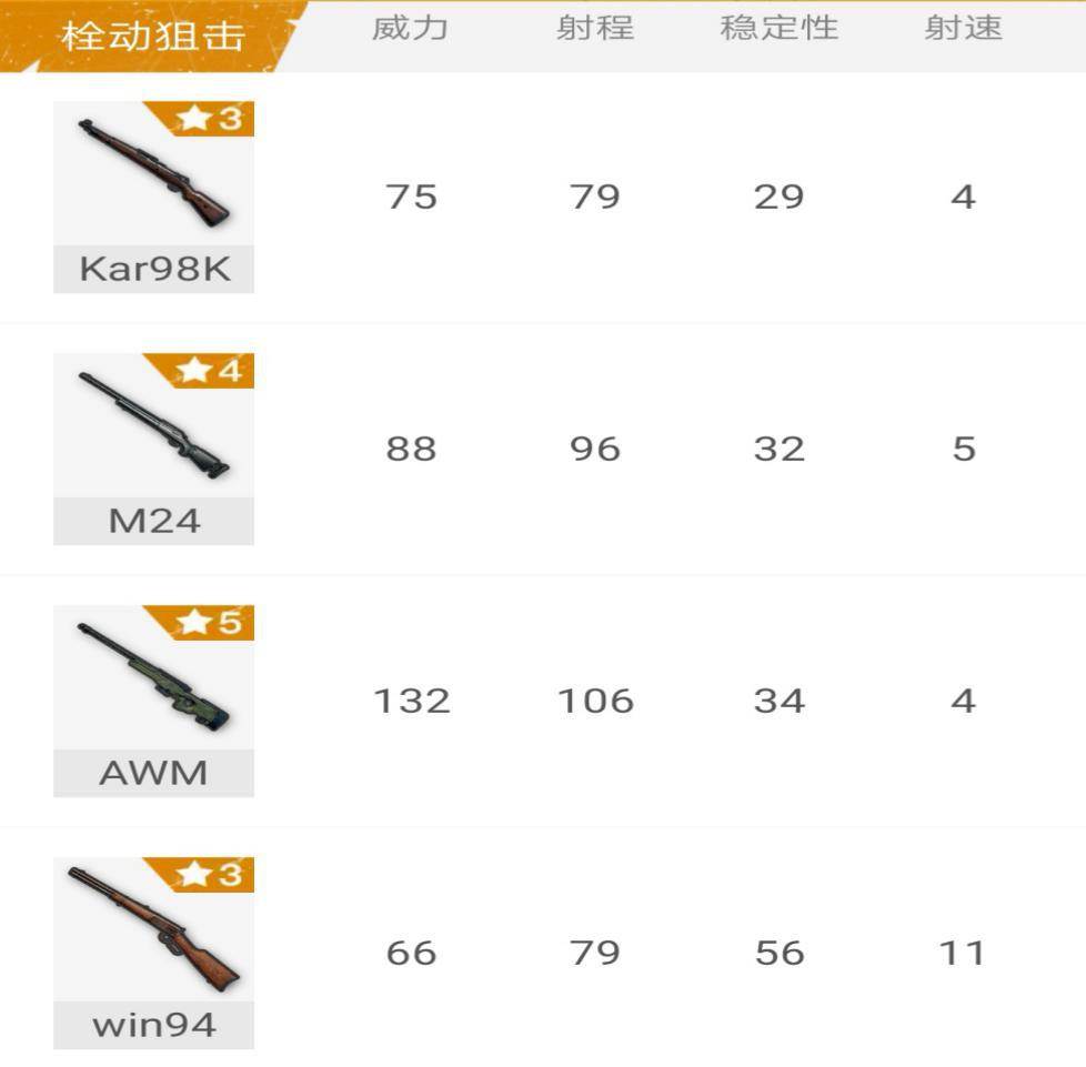 首先栓狙是指栓动狙击步枪,每一枪都需要手动的上膛和退膛。目前栓狙只有四种,分别为:Kar98K、M24、Win94以及只在空投里刷新的AWM。