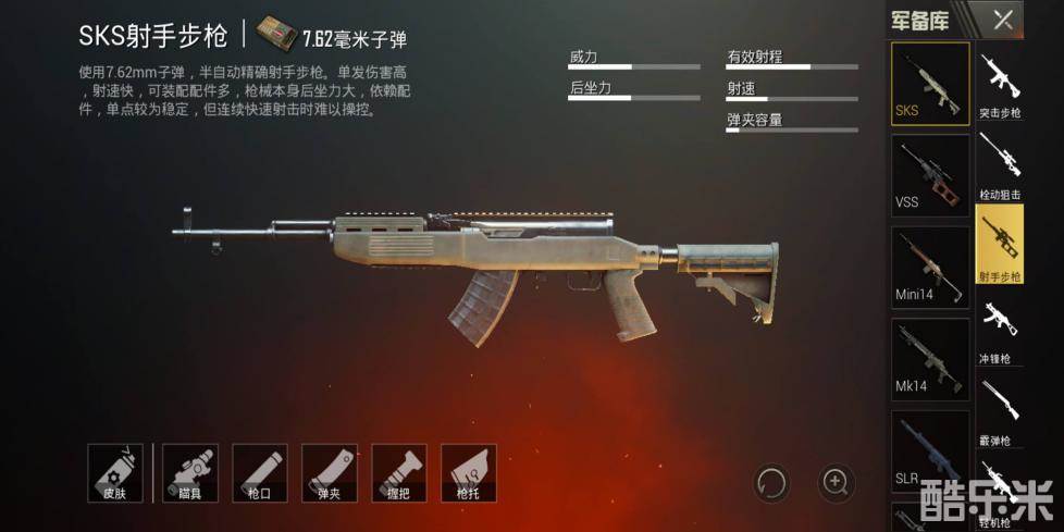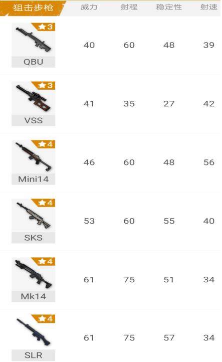 在射手步枪中,威力最大的并不是配件之王SKS,而是MK14和SLR,均为61伤害,射程也同为射手步枪中的NO.1,达到了75点,略低于98K。在栓狙和射手步枪中有两把较为特殊的武器——Win94与VSS。