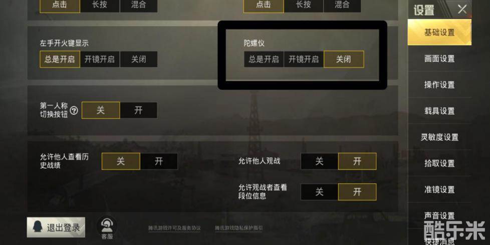 如果觉得在使用狙击枪的过程中很难做到精确瞄准,那么还可以借助陀螺仪,在基础设置里往下滑就可以找到,建议使用开镜开启模式。