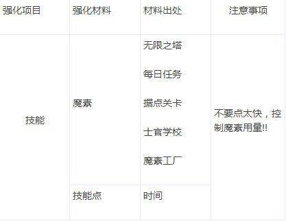 另外,随着等级的上升,特殊的技能也会随之开放,到25等时所有的技能都会开启,但要继续点高仍有等级限制,技能消耗魔素及技能点数,技能点数会自动恢复,而魔素则是由关卡、教官或工厂中取得,因为魔素消耗量非常的大,都是1点几万在用的所以要谨慎使用。