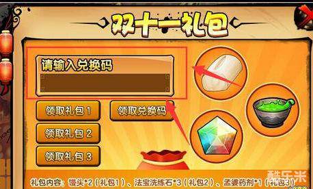 第三步:输入你获得的兑换码,馒头*2对应的是礼包1领取按钮,法宝洗练石*3对应的是礼包2领取按钮,孟婆药剂*1对应的是礼包3领取按钮,小勇士们不要弄错哦~