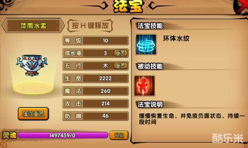 这个法宝可以很屌的,满级后可以一次回500+血,如果是木系的话冷却仅10秒,加上被动回血技能,耗战专属,而且还能免疫一切负面效果,还有这属性加成可不少啊,就是样子太挫了。
