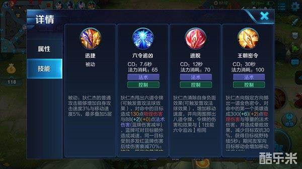 狄仁杰解除自身的负面效果,增加移速并甩出八道令牌,此技能更是射手中的神技,在团战中走位不慎中了控制性技能时可用此技能保命,防止被对面一套带走。移速的加成使得狄仁杰的团战跑位更加轻松,对于输出位置的要求也没有那么苛刻。