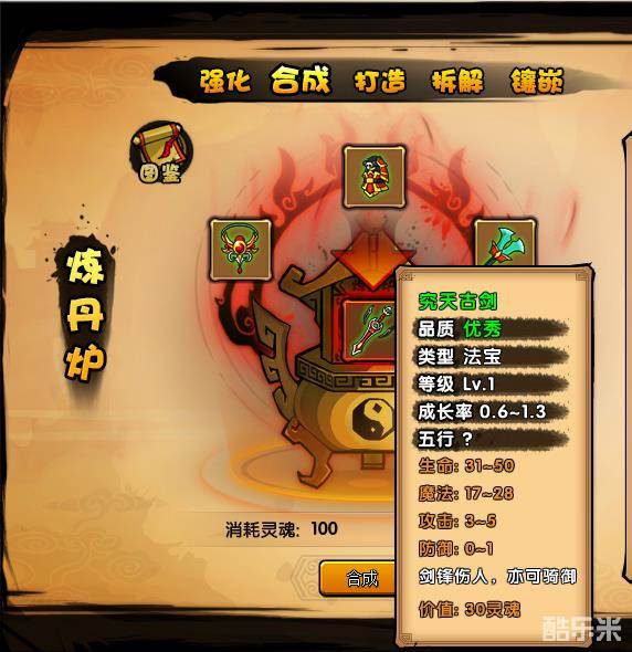 这里,我们需要介绍一个法宝,就是我们第二章金遮长安的时候,三个关卡掉落物品的合成法宝。就是,我们的究天古剑拉。这里我们将前面三个关卡的装备每个刷两个,一套自己人物身上佩戴,另一套就用来合成古剑