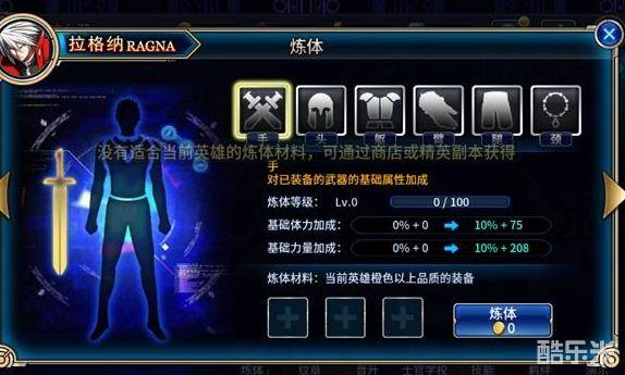要想进行炼体,你必须要有45评分的橙装,每个部位都要有两件以上,你可以选择一个部位,在选择对应装备,然后消耗其中的一件进行炼体,完了可以提升人物对应部位的属性。
