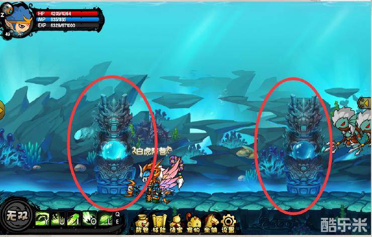首先,我们看到九龙宝殿前面的四幅地图里面都有宝珠,我们打击之后就可以点亮。