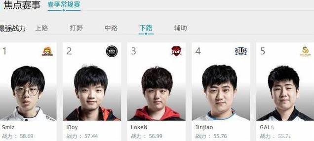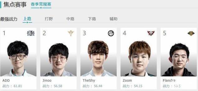 上单位置上战力值最高的是BLG的上单ADD,因为是刚加入的韩援,还在BLG这支比较低调的战队,所以一直没有受到太多的关注,但是如果看了BLG和Snake那场比赛的观众,应该会印象深刻,ADD基本上是全方位的压制了圣枪哥,这也是导致了后面圣枪哥微博遭到大量网友的爆破,因为他被打得太惨了。上单位置第二名给到了V5的Jinoo,第三名给到了IG的上单TheShy,第四名是JDG的Zoom,第五名是Snake的圣枪哥。总体来看,比起上个赛季的抗压型上单,这个赛季的输出型上单已经开始统治LPL了。