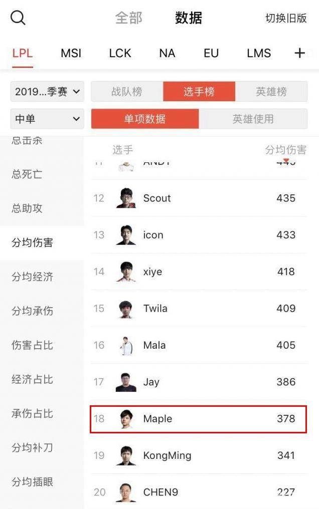 因为是中单位置,打输出的能力非常重要,而且前面的版本一直是中野版本,对于中单的要求就更高了。LPL一共十六个战队,加上各队的替补,上场的一共有20位中单,maple的分均伤害排在第18位,只有378。分均伤害最高的是IG中单Rookie,第二位就是maple的替补中单Angel,第三位是knight。