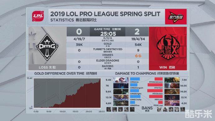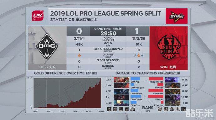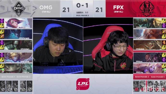 26分钟,FPX再次RUSH下大龙,利用大龙BUFF兵不血刃推下中路高地,回家整顿后再推下OMG下路高地,OMG无力反抗,首局失利。