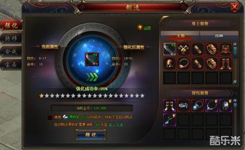40级装备可以进行强化,强化装备共分为20级,强化等级每提升1级,装备基础属性都会获得大幅度提升。强化有一定的成功率,成功会提升一个强化等级,强化失败不会下降强化等级,但是要扣除本次强化的消耗材料。玩家可以通过使用特定材料使得强化获得100%成功率。
