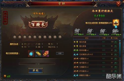 玩家每日完成官职活跃任务即可获得官职经验从而升级官职,提升属性奖励,更能提升每日官职奖励。