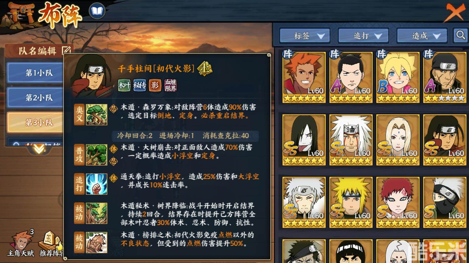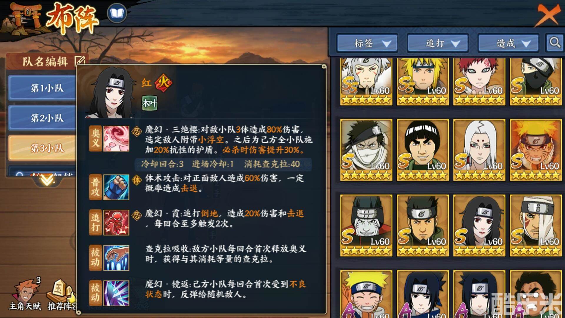 我爱罗[少年篇]:这名忍者和鹿丸[少年篇]类似,他的奥义和追打都有定身效果,唯一不同的是我爱罗[少年篇]可以抗伤害,因为自身的被动可以增加护盾,所以搭配时把我爱罗[少年篇]放在森乃伊喜比的前面,这样有着保护森乃伊喜比的作用。