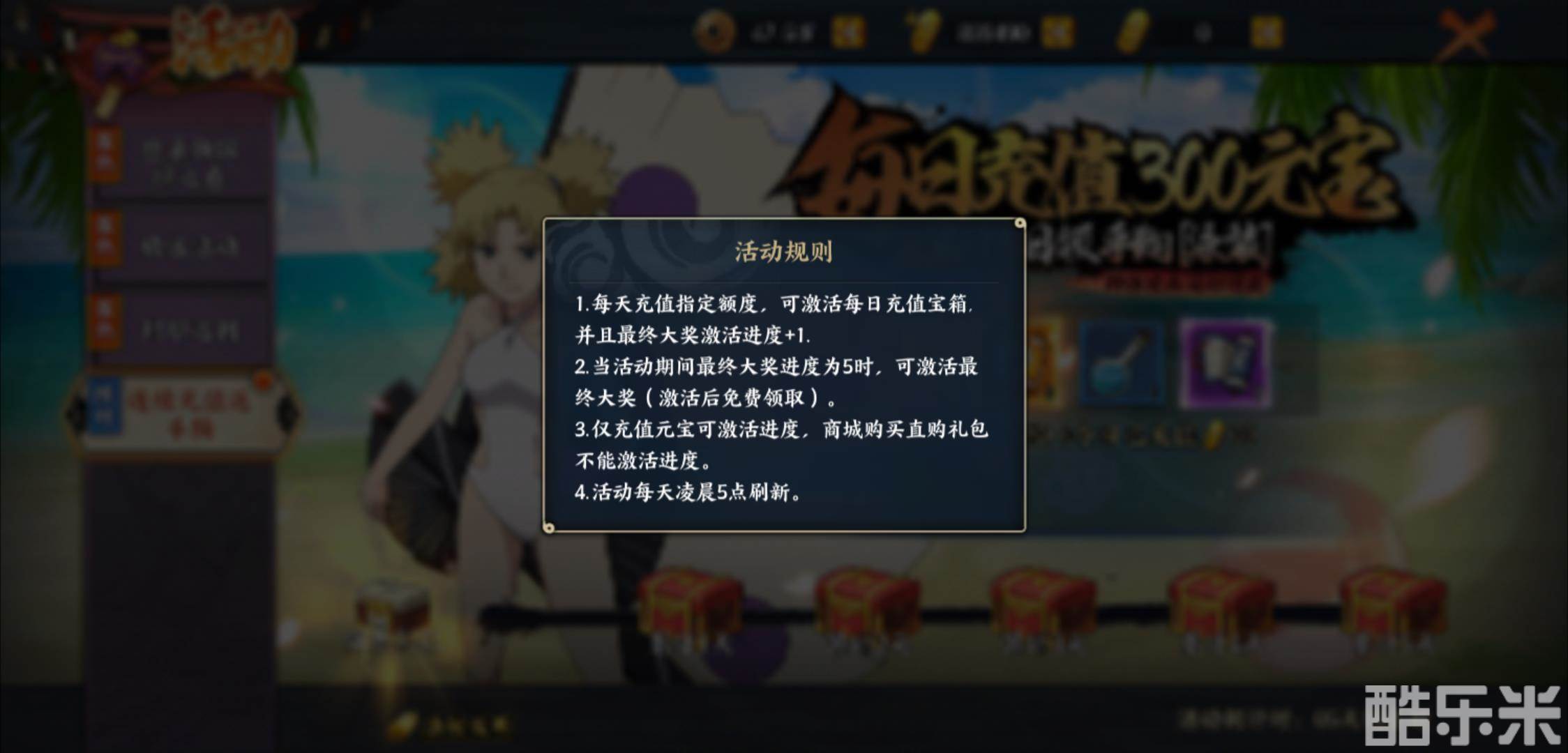 1. 每天充值指定额度,可激活每日充值宝箱,并且最终大奖获取进度+1.