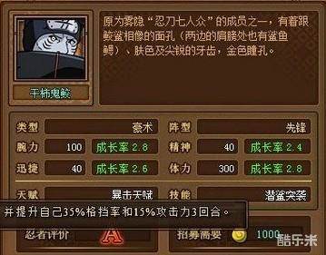 在木叶世界中,鬼鲛属于进攻型。鬼鲛的暴力天赋、全军攻击范围、使得他能够提升全队的攻击力,给后军带来很大的威胁。而且这次90%上限的变化后,鬼鲛的暴击天赋不再是其软肋,反而更贴近了他的定位。由于试炼中,对手都是几十万的血,鬼鲛的防御偏弱,不如角都顶得住,但如果有迪达拉和蝎在的情况下,鬼鲛可以很好的弥补上阵伙伴伤害输出的劣势。