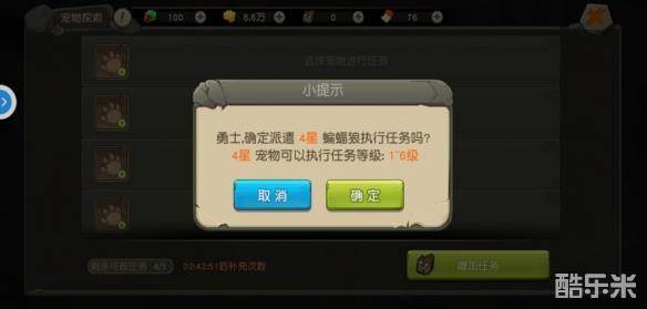 所有的宠物都可以被派出,点击加号选择派出的宠物后,系统会自动分配任务。不同星级的宠物可以分到的任务等级也不同:1星的宠物可以执行的任务等级为1-3级,2星的宠物可以执行的任务等级为1-4级,以此类推。
