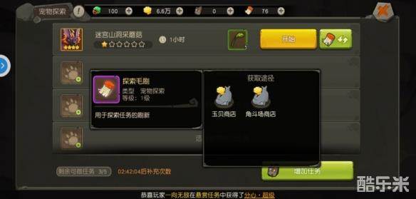 “宠物探索”全天开放,但剩余可做任务次数补充需要花费一定时间。如果觉得次数不够,想要增加任务,可以通过玉贝商店购买探索石板实现,一个探索石板增加一个探索任务。