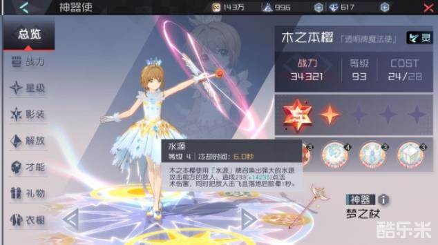 木之本樱使用【水源】牌召唤出强大的水源攻击前方敌人,造成法术伤害同时把敌人击飞且落地后眩晕1秒。