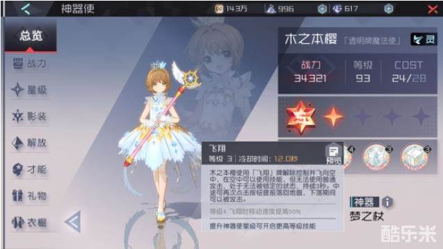木之本樱使用【飞翔】牌接触控制并飞向空中,在空中可以使用技能,但是无法使用普通攻击,处于无法被锁定的状态,持续3秒。中途可以再次点击按钮提前落回地面,下落期间可以被攻击。