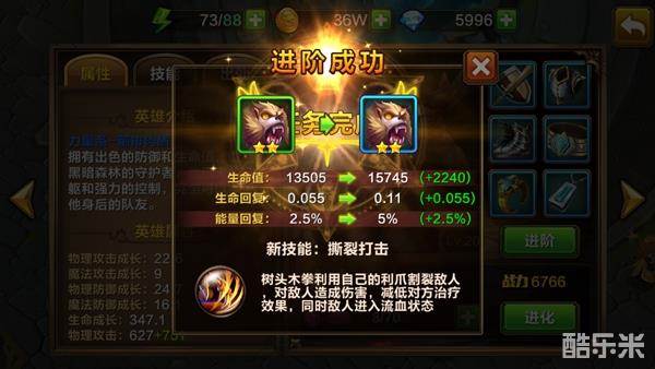 每当玩家收集齐某些特定的材料,都可以消耗金币对特定英雄的指定装备进行进阶,当英雄身上的每一件装备均进阶到更高一阶之后可以对英雄进行进阶。进阶会增加英雄的属性,每次进阶到指定品阶后还会解锁英雄的新技能。