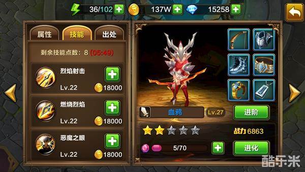 每个英雄都会有自己独特的四个技能,每个英雄升级到指定品阶时都会解锁新技能,技能可以花费金币进行升级,每次升级技能都会得到加强。
