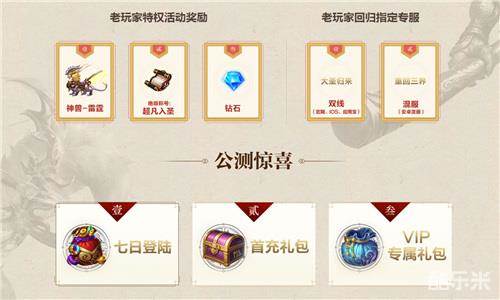 在《大圣之怒》6月9日全平台公测之际,官方也为众妖准备了丰厚的奖励,无论是新伙伴还是旧战友都将有海量礼包!6月15日将开启老玩家回归活动,只要进入专服即可获得极品神兽坐骑雷霆、限量绝版称号——超凡入圣以及大量的钻石,助你王者归来!而新玩家也将有七日登录送极品神将武器、首充礼包和VIP专属特权等好礼,必能战力无双、逆天斩神!此外,关注《大圣之怒》官方微信即有微信专属礼包相赠!发送双枪战斗截图至公众号更有双枪礼包,还不赶快参与!