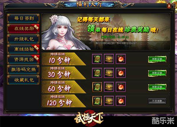 持续在线一定时间后可领取在线礼包,在线礼包分成4个档次,分别为在线10分钟、30分钟、60分钟、120分钟,福利也是相当不错,其中包括经验卡、绑定元宝卡、重生丹这些常备消耗品。每天上线后只需挂机保证4个小时,就可以领取全部在线奖励。