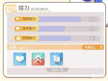 每个指挥喵都有各种各样的天赋,天赋可为舰队提供各种针对舰种or阵营的属性加成