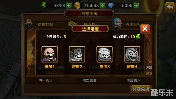 每个副本都有4个难度,难度越高,获取的奖励越多,这些奖励可以通过”历练商城“兑换自己需要的物资、道具等。
