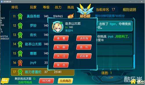 玩家只能挑战位于自己前面名次的玩家(前7名除外),最多可见自己名次前7名玩家,每日免费挑战次数有限。