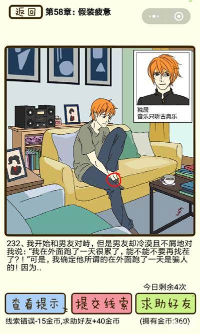 在再见吧渣男手游中假装疲劳第232关究竟该怎么过呢?在这一关中相信很多人都不是很清楚男友出轨的线索究竟在哪里,那么下面就来看一下吧~!