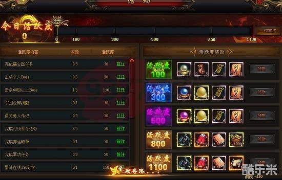 当玩家收集到100点、300点、500点、800点、1100点活跃度时,可以领取相应的活跃度奖励。每份活跃度奖励每人每天可领取一次,每天24点重置任务奖励。