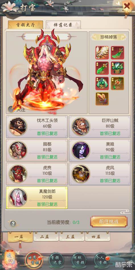 击败世界首领,有几率掉落极品装备和外形道具,等级越高,掉落越好;每击败一个世界首领,掉落归属者将会增加一点疲劳值;击败比玩家低于一定等级的首领将无法获得掉落奖励;当玩家疲劳值满时,当天将无法再对世界首领造成伤害;疲劳值每天0点重置。