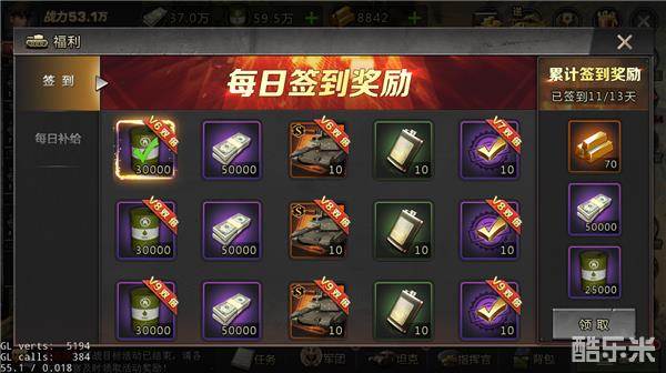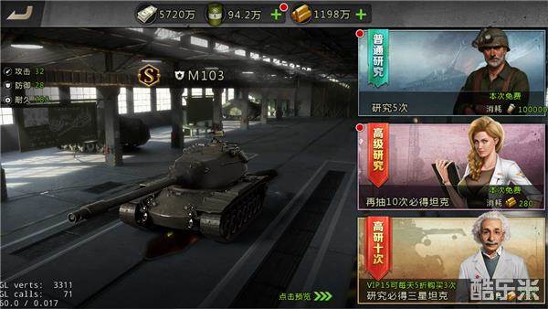 《战地指令》作为坦克题材游戏,收集坦克当然是重中之重,除了每天免费抽取的外,推荐进行十连抽,必得3星坦克,运气好能一下出几辆高资质坦克,VIP1即可5折十连抽(注:开服次日登录会送VIP1哦),钱花在这里性价比最高,对战力提升帮助也最大!