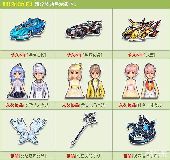 2月28日-4月8日购买角色经验卡+800,获赠:狂欢K歌卡,开启有几率获得:永久S车【海神之刺】/【炼狱使者】/【沙皇】、永久极品【暗雪情人套装】/【黄金飞马套装】/【胜利天使套装】或其他奖励之一!获得核心奖励永久型概率是:2%-4%,获得核心奖励期限型概率是:4%-6%,获得非核心奖励概率是:90%-94%。