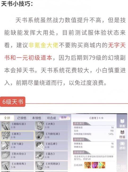5、天书的属性有领悟属性和装备属性两种,领悟的天书会被消耗,但是可以装备,不能用于升级合成,具体天书合成配方游戏内查看。