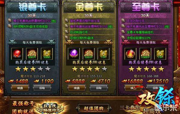 最后编辑于6年前《攻铩》设立有三大特权等级:银尊、金尊、至尊。不同的特权等级代表着不一样的特权内容,不同的特权等级又有不一样的价格。对此有很多玩家有疑问,到底特权卡有没有必要买?是打包购买划算还是单独购买划算?今天,我们就通过这篇攻略来讨论一下。
